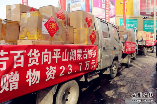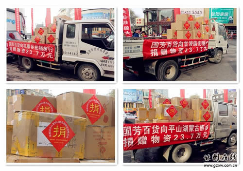 11月22日上午,張掖國芳百貨公司7周年慶典之際,為我區(qū)甘浚鎮(zhèn)光明村、花寨鄉(xiāng)柏楊樹村和平山湖鄉(xiāng)困難群眾一次性捐贈了價(jià)值71萬元的物資。區(qū)委常委、常務(wù)副區(qū)長秦偉、副區(qū)長張興鋒出席了捐贈儀式。