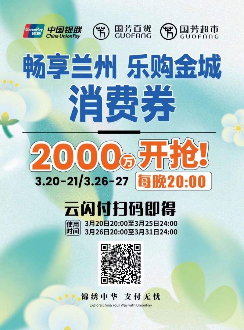 本次消費(fèi)券具體發(fā)放時(shí)間為3月20日至3月31日,將分2個(gè)階段4個(gè)批次發(fā)放,分別為3月20日、3月21日、3月26日、3月27日的每晚20:00至24:00。消費(fèi)券涵蓋國芳百貨、國芳超市以及國芳百貨內(nèi)的餐飲場所等3個(gè)場景共計(jì)38萬余張,消費(fèi)范圍覆蓋美妝、服飾、餐飲及國芳超市等多品類消費(fèi)場景,旨在激發(fā)春季消費(fèi)潛力,鞏固傳統(tǒng)消費(fèi),共同繁榮城關(guān)商貿(mào)經(jīng)濟(jì),助推零售商業(yè)市場平穩(wěn)發(fā)展。(廣大市民將通過“云閃付”APP領(lǐng)取并核銷,具體活動(dòng)規(guī)則、適用范圍等信息可登錄“云閃付”APP查看。)